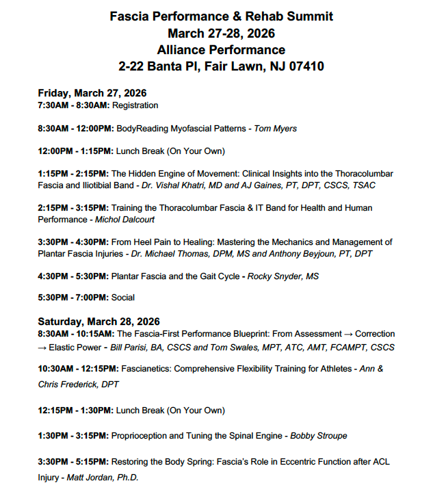 Learn how to apply the latest fascia-aware training techniques and tools to reduce client injury-risk while improving athletic performance and enhancing overall fitness at this two-day hands-on summit featuring research-backed principles presented by top experts in the field including: Bill Parisi, Tom Myers, Dr. Vishal Khatri, AJ Gaines, Michol Dalcourt, Dr. Michael Thomas, Garrett Rumsby, Rocky Snyder, Tom Swales, Ann & Chris Frederick, Bobby Stroupe, and Dr. Matt Jordan.